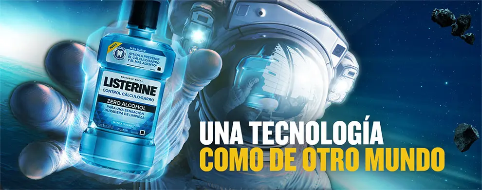 LISTERINE® Control Cálculo ZERO™ Alcohol te protege a un nivel tan avanzado que la única manera de explicarlo es pidiéndote que imagines tu boca como un campo de batalla espacial… Cierra tus ojos y visualiza la placa bacteriana como amenazas extraterrestres que atacan constantemente tus dientes, comprometiendo la salud de tu boca y la estética de tu sonrisa ¿qué necesitas para salvarte?... Una tecnología que te proteja por más tiempo, 3 veces más tiempo*, así la placa bacteriana no tendrá tiempo de desarrollarse hasta calcificar el cálculo en tus dientes. Salvando a la tripulación de tu boca con cada enjuague.